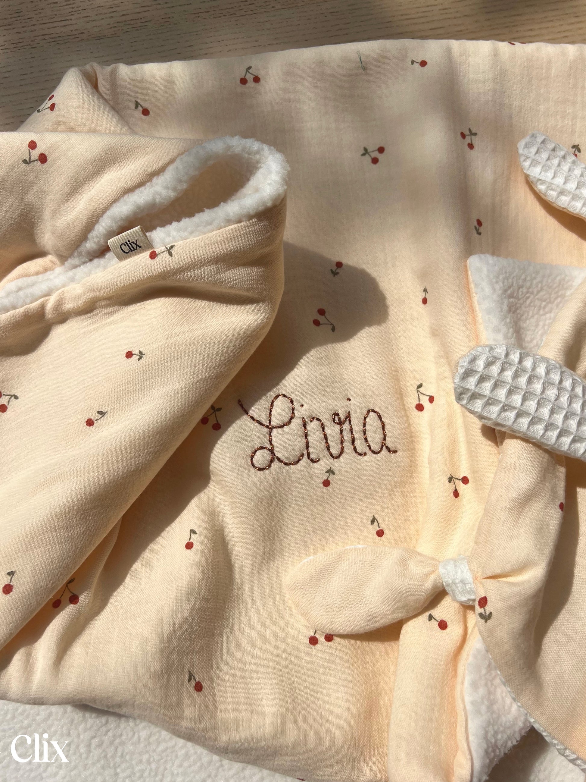 Il est possible d’ajouter une broderie pour personnaliser la couverture sur les tissus unis (comme les gaze de coton)