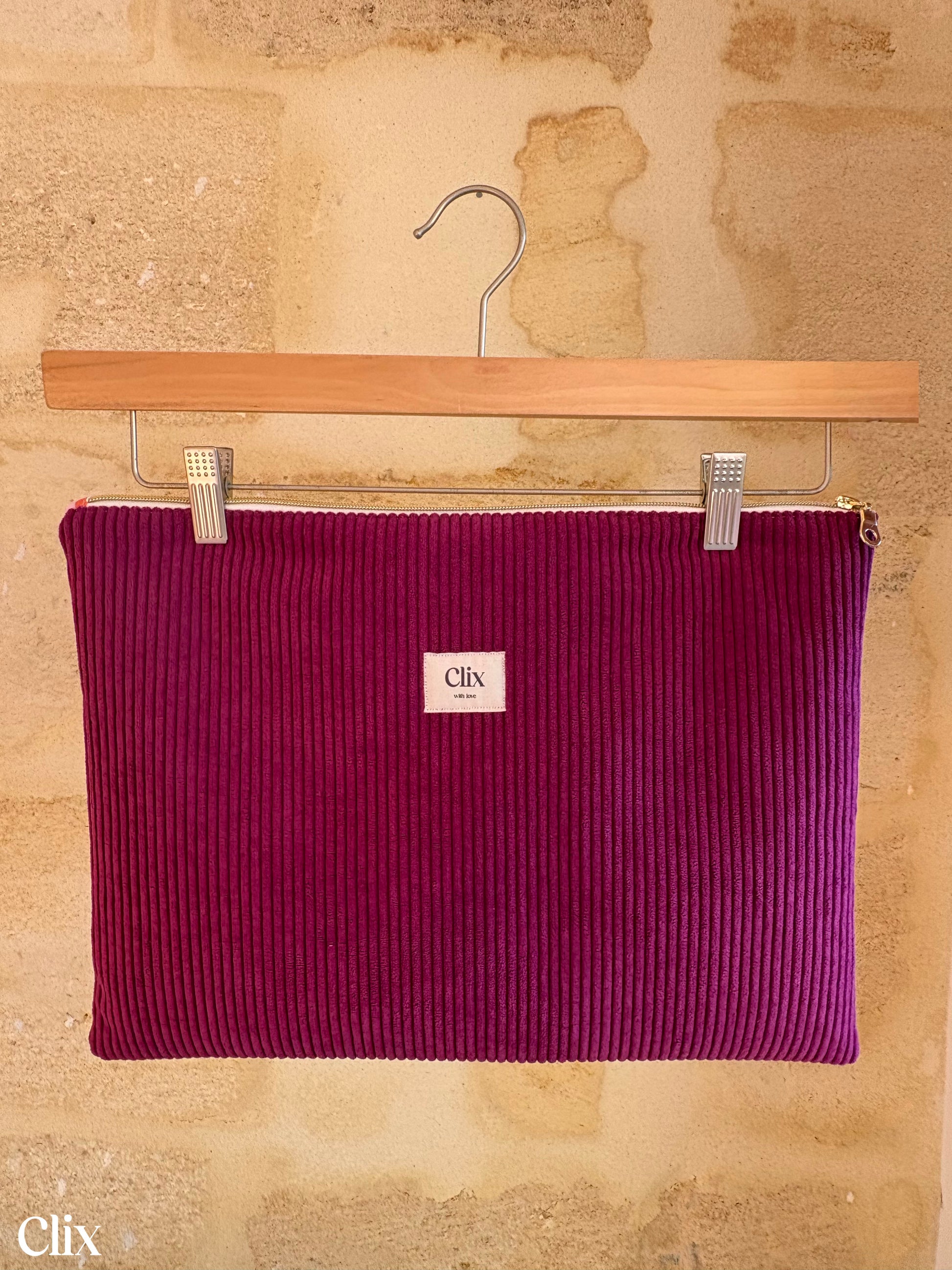 La housse présentée est au format 15’ pouces en velours fuchsia avec une doublure léopard rose et orange. Elle peut être déclinée sur d’autres tailles.