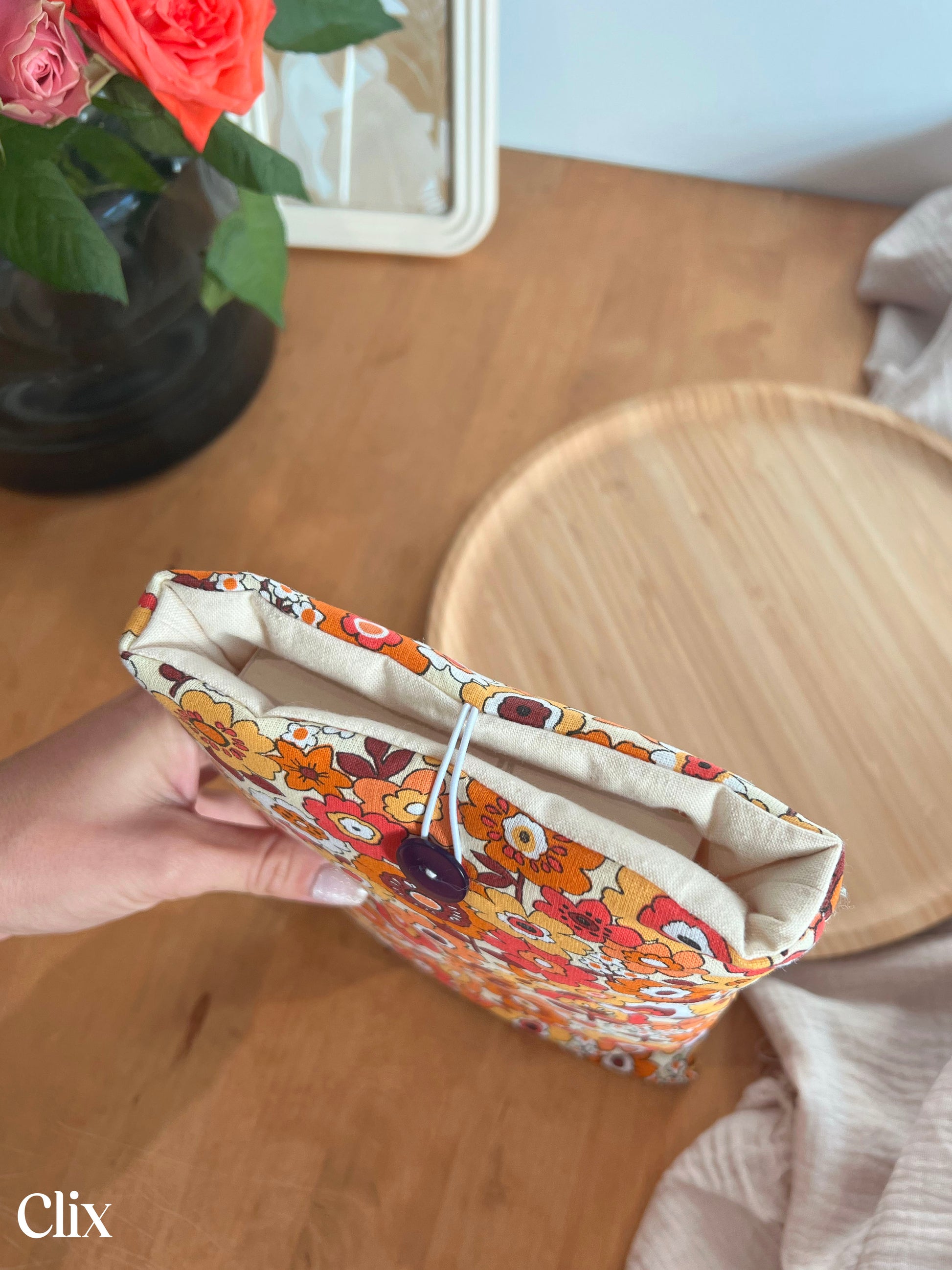 Elle existe en version poche ou version brochée. Cette housse molletonnée est fermée grâce à un élastique et un joli bouton vintage.