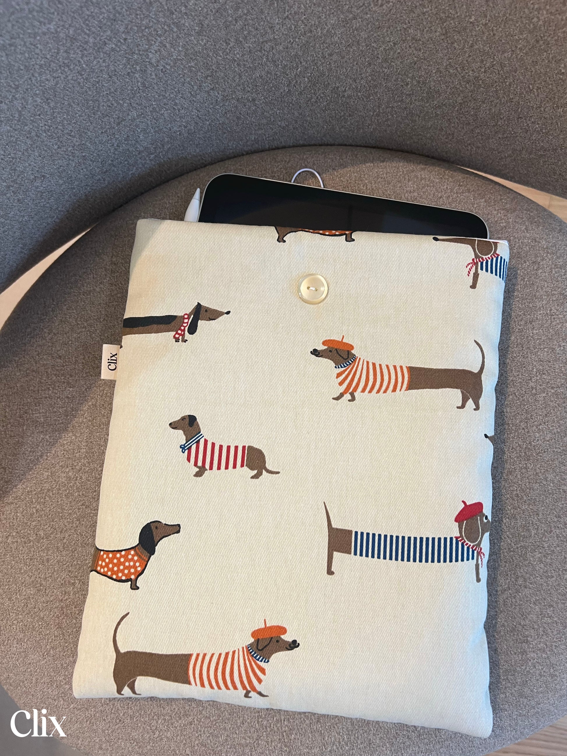 Elle existe en version poche ou version brochée. Cette housse molletonnée est fermée grâce à un élastique et un joli bouton vintage.
