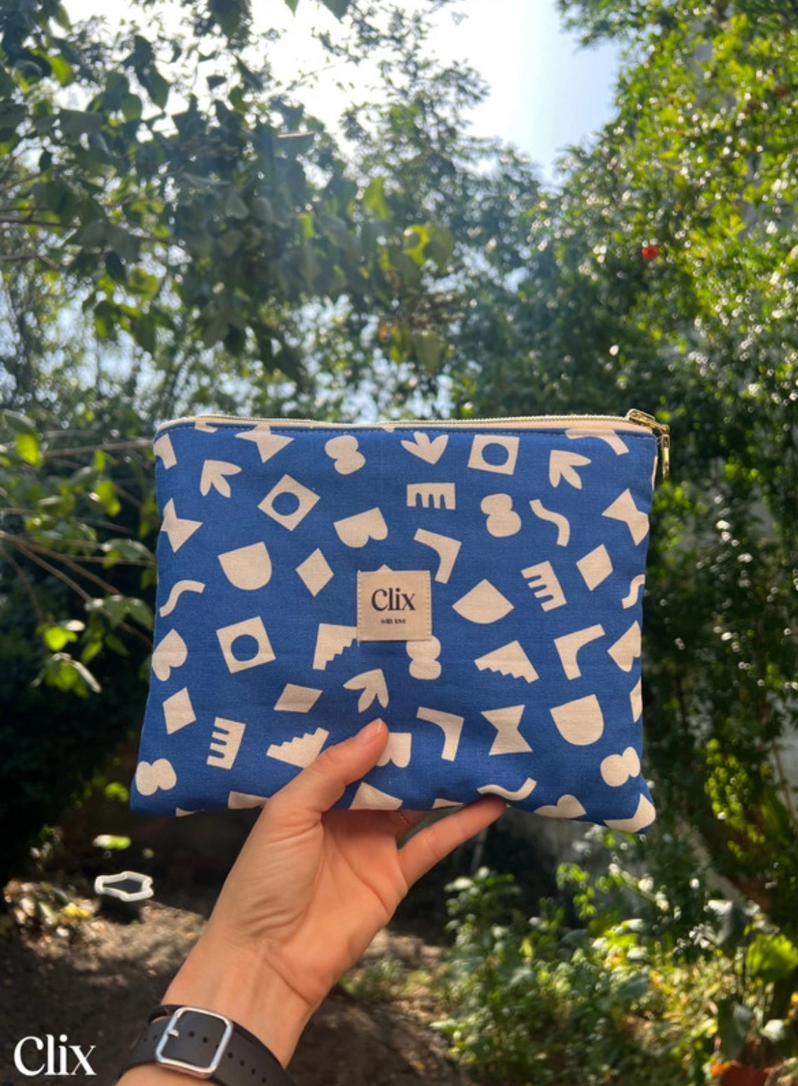 Elle possède une large ouverture et une étiquette Clix en tissu en drapeau sur le côté ou cousu au centre de la trousse.